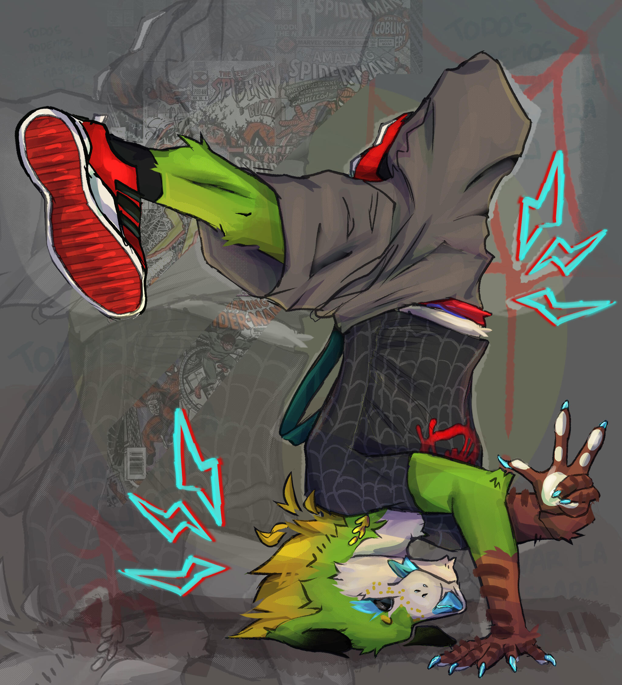 I also paint with spray cans, mostly at night, when the city is half asleep and all that’s left is the sound of the can shaking. But not everything is chaos and concerts. I’ve got a calmer, kind of nerdy side too — it reminds me of Spider-Man!That’s who I am. Half street, half laboratory. One foot on the asphalt and the other in the clouds. And even if it doesn’t seem like it fits... that’s just how I work.ATT: Kind of a mix between greyhound and plant // Slim and tall.
